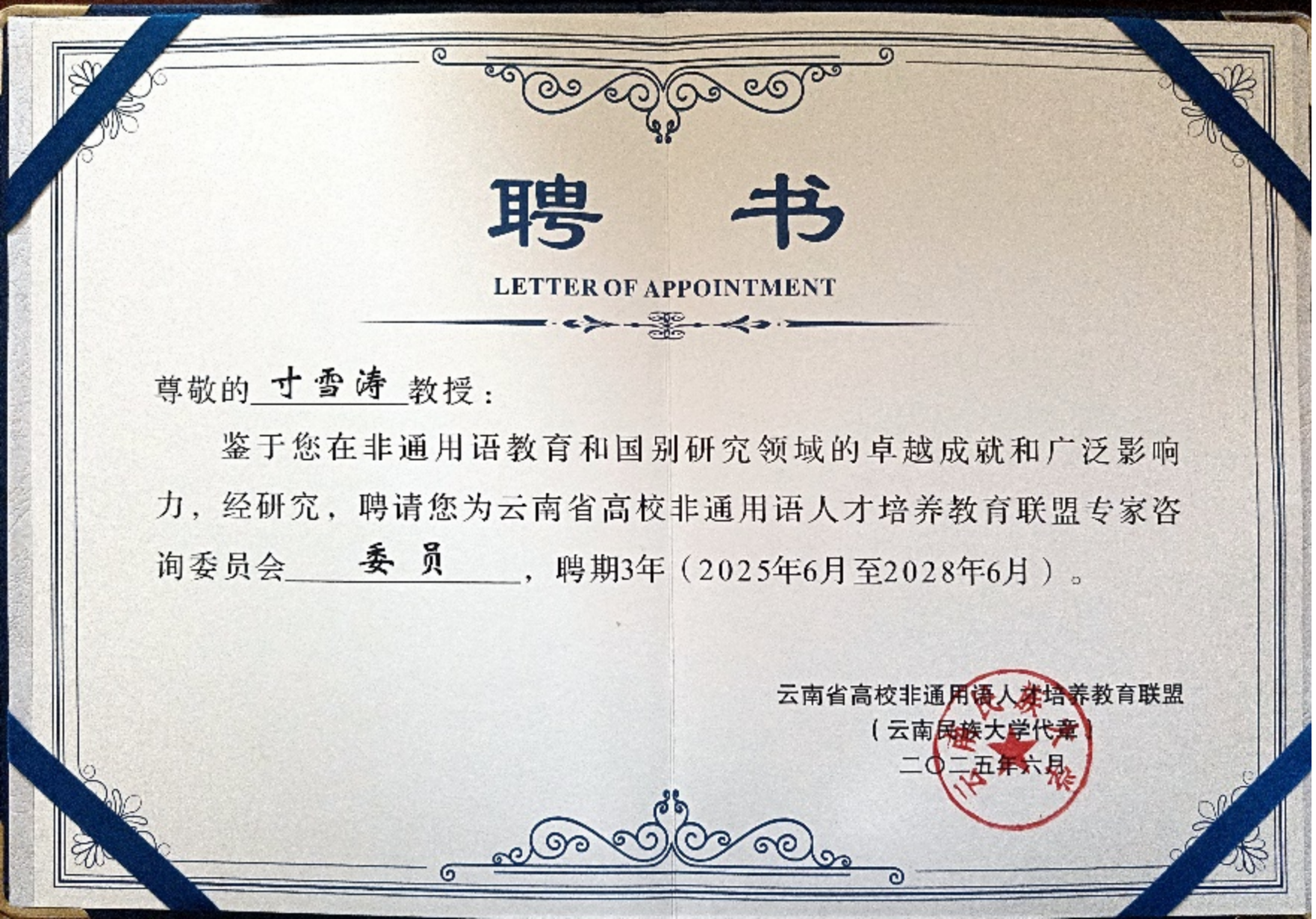会议宣布成立云南省高校非通用语人才培养教育联盟专家咨询委员会的决定,并为委员会成员颁发聘书。专家咨询委员会主任委员为教育部高等学校外国语言文学类专业教学指导委员会副主任委员、非通用语种类专业教学指导分委员会主任委员、清华大学国际与地区研究院院长姜景奎教授,副主任委员为教育部高等学校外国语言文学类专业教学指导委员会非通用语种类专业教学指导分委员会秘书长、北京大学外国语学院副院长吴杰伟教授及北京外国语大学亚洲学院院长苏莹莹教授。我院学术委员会主任、教育部高等学校外国语言文学类专业教学指导委员会非通用语种类专业教学指导分委员会委员、东南亚语言文化系教授寸雪涛受聘担任专家咨询委员会委员。寸雪涛教授受聘担任专家咨询委员会委员,既是对其学术地位的认可,也是上级主管部门及学界对我院非通用语种类专业发展的肯定。